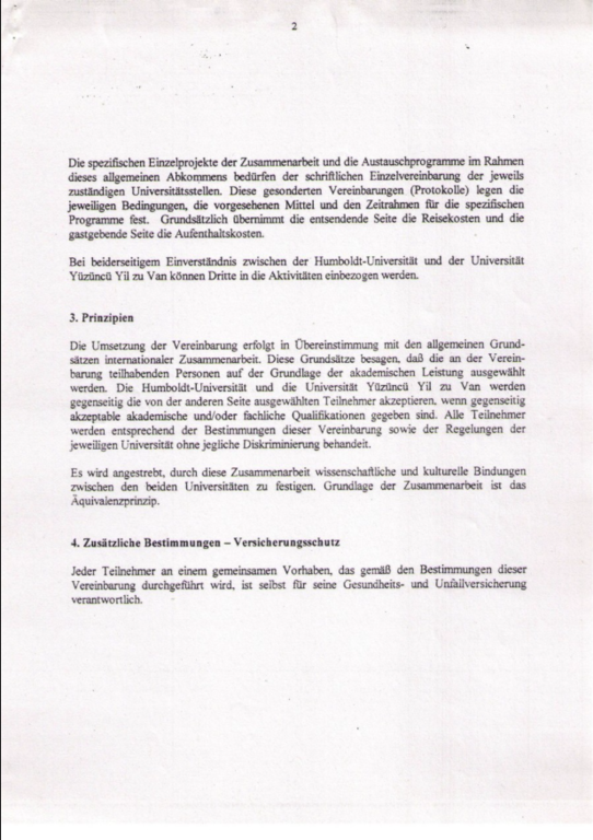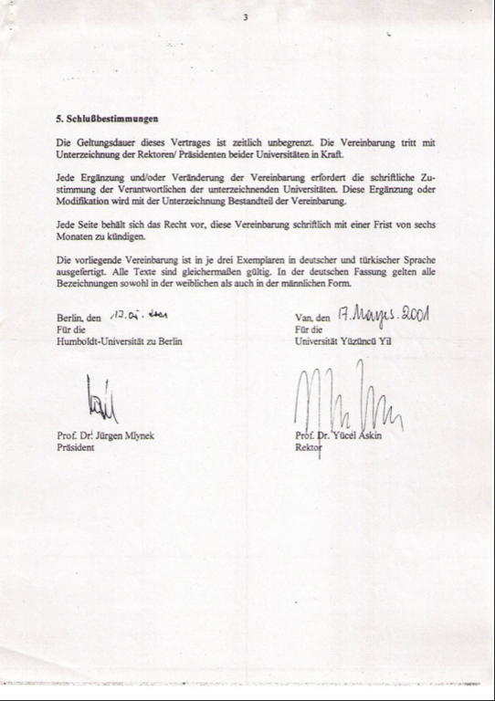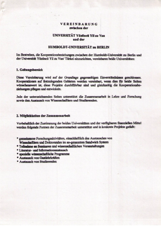 Kooperationsvertrag zwischen der Humboldt Universität zu Berlin und der Yüzüncü Yıl Universität in Van, Türkei